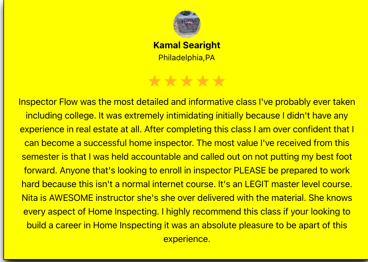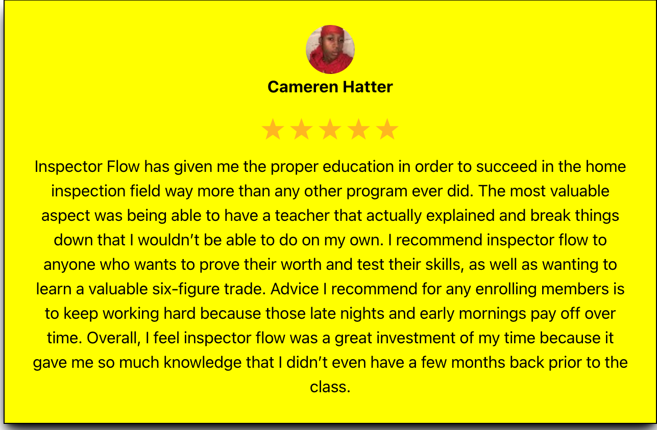 You’re trained live, in a virtual classroom setting. We walk you through each system one by one, keep you accountable, and make sure you actually learn before moving on. Every class builds your confidence and skill so when it’s time to inspect a real house, you know exactly what you’re doing.